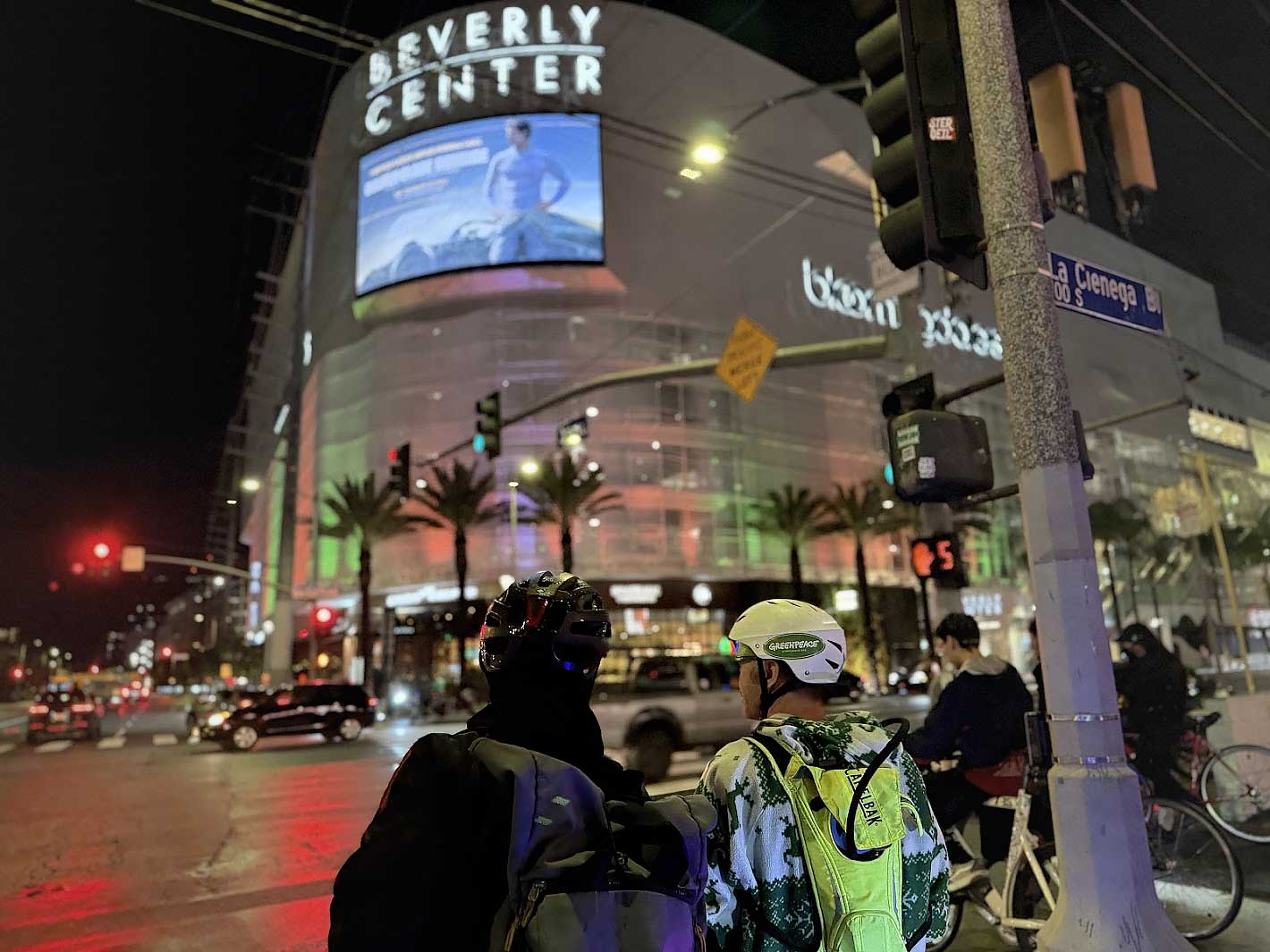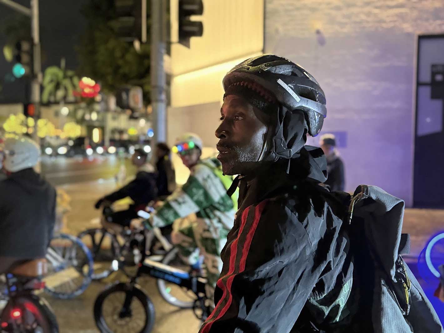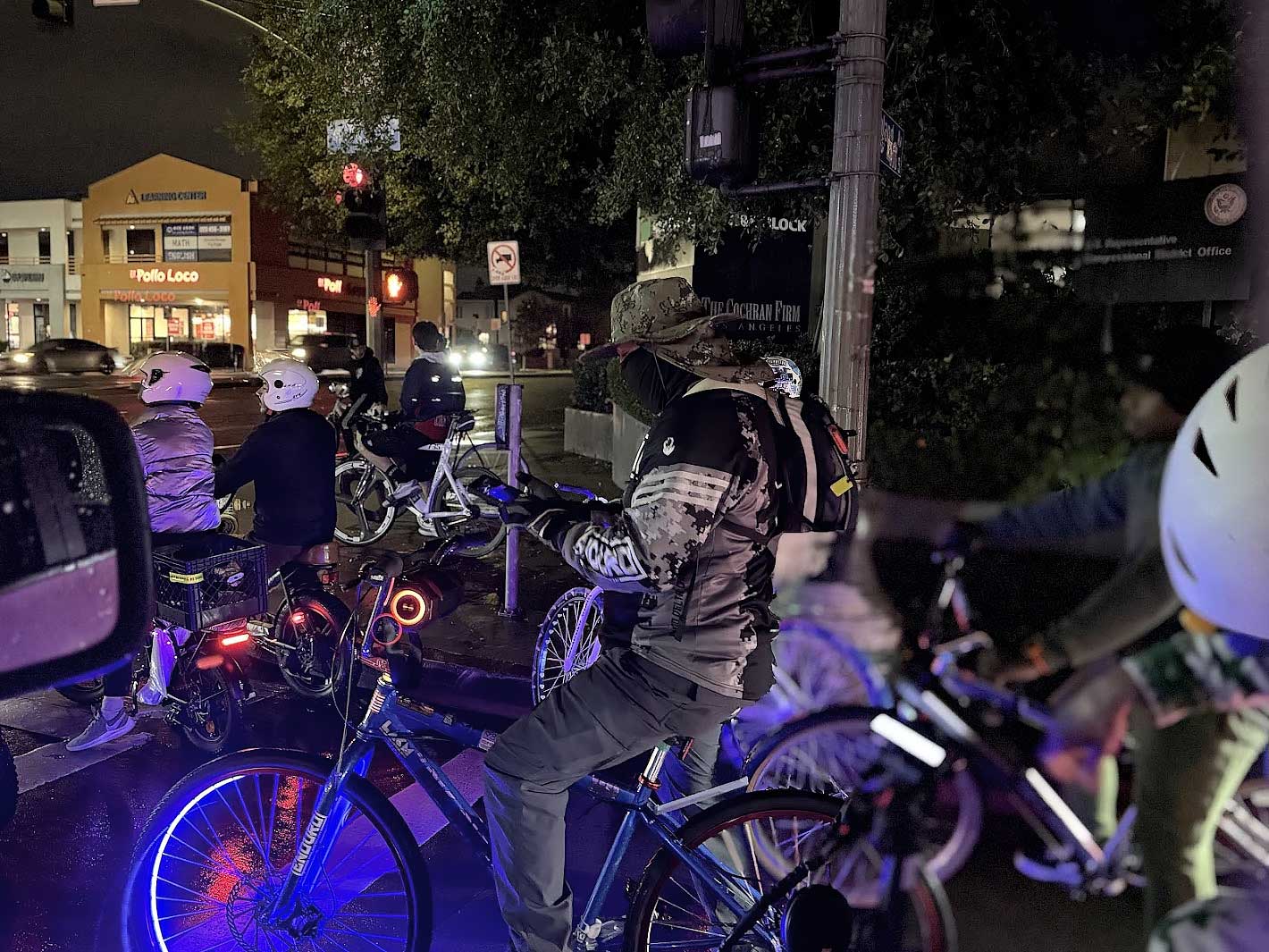 Our main break took place at Beverly Hills Garden Park, where riders filled the entire space — bikes lined up, music playing, people resting, talking, and taking in the moment. It was a sea of lights and color, a community gathered in celebration.
