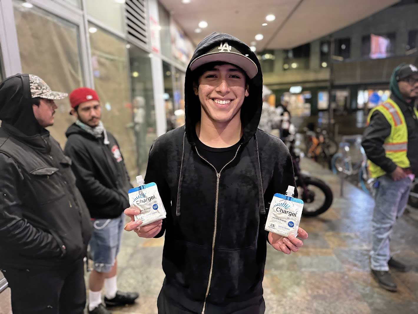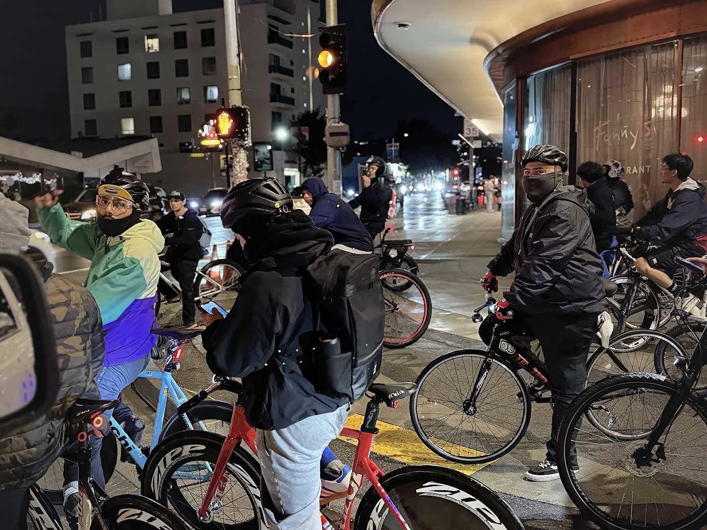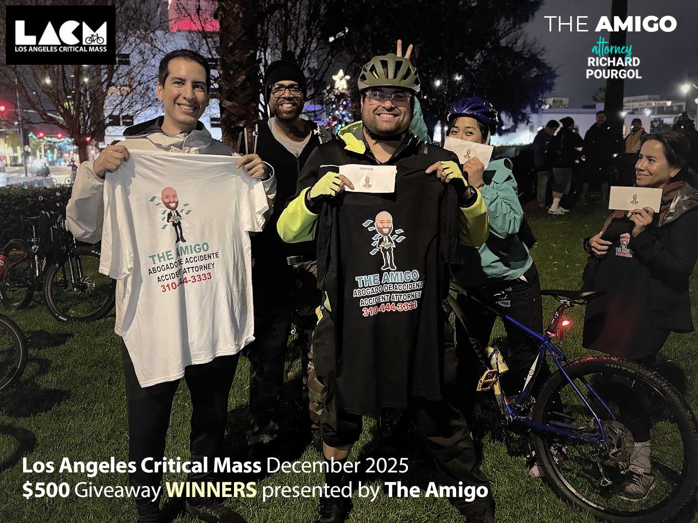Even as the rain softened into a drizzle, a few hundred riders gathered at Western & Wilshire. Cyclists came from all over — Los Angeles County, the Valley, the South Bay, the Inland Empire, Orange County — determined to close out the year together. Our sponsor, The Amigo, added to the excitement with a $500 holiday giveaway, with five riders set to win $100 each during our main break.