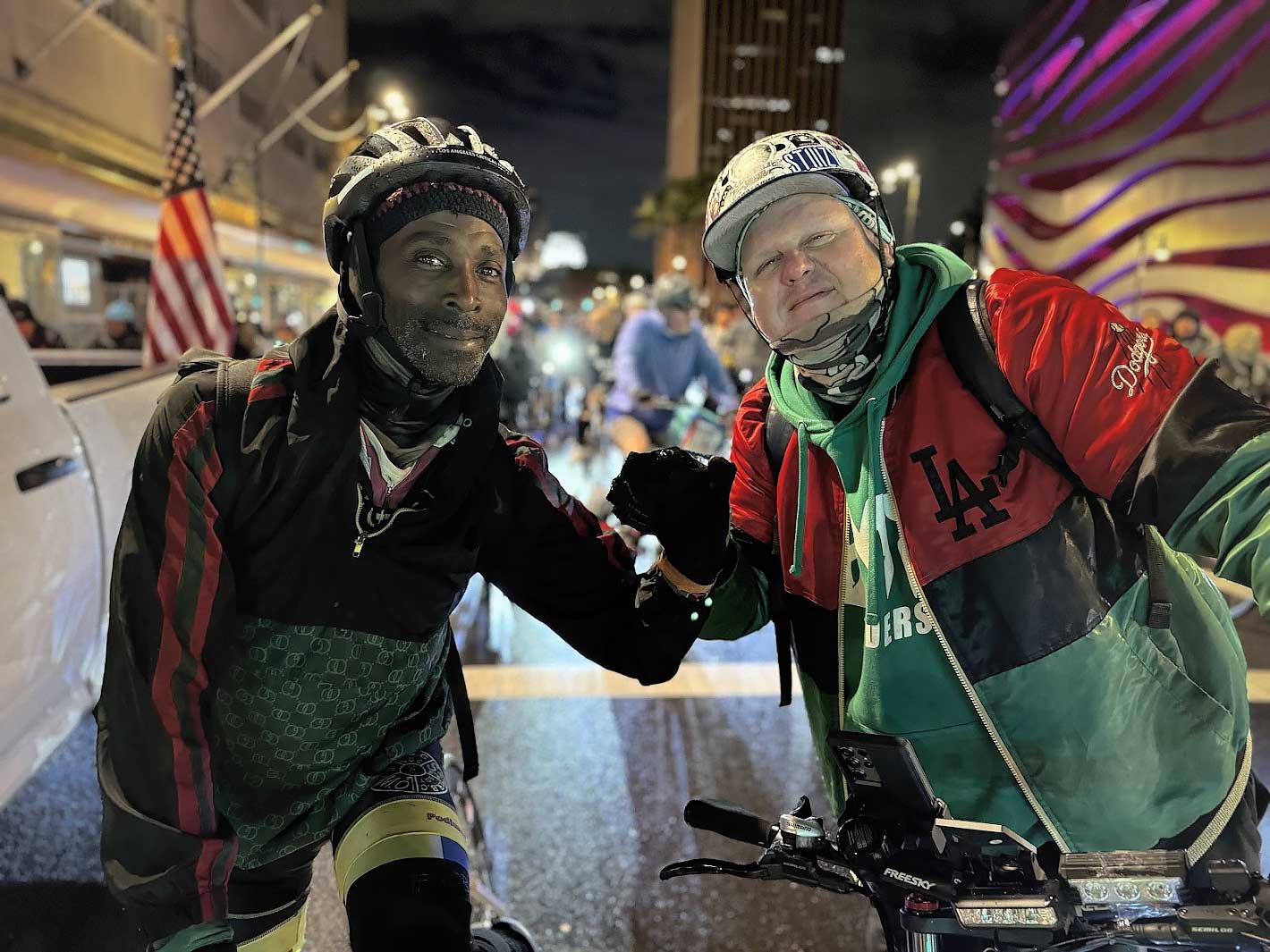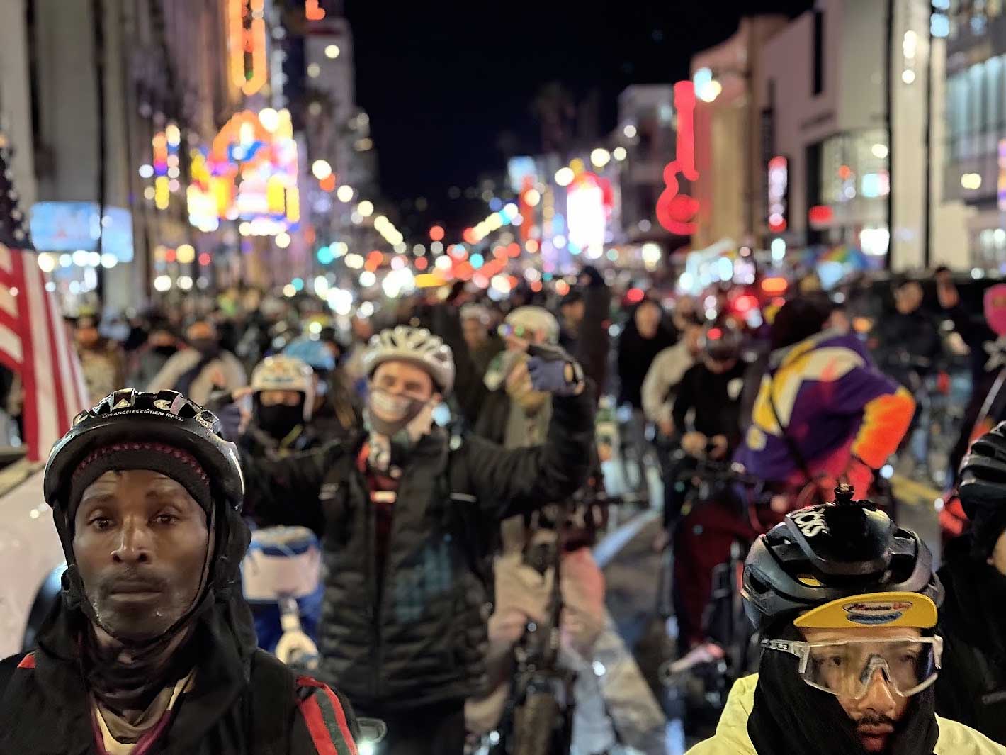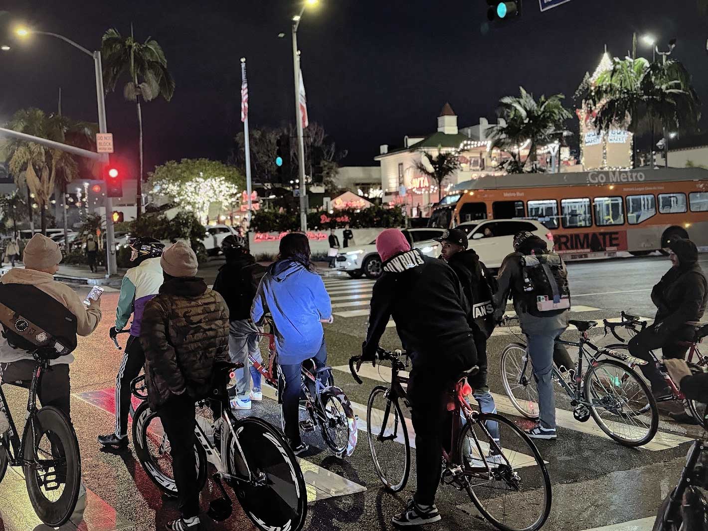 The moment our wheels hit Hollywood, the atmosphere erupted. Tourists and locals stopped in their tracks, phones out, capturing the endless stream of cyclists rolling through one of the most iconic streets in the world. The holiday lights, the music, the sheer size of the ride — it all came together in a moment of pure joy.