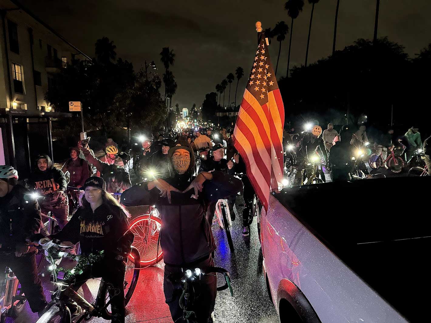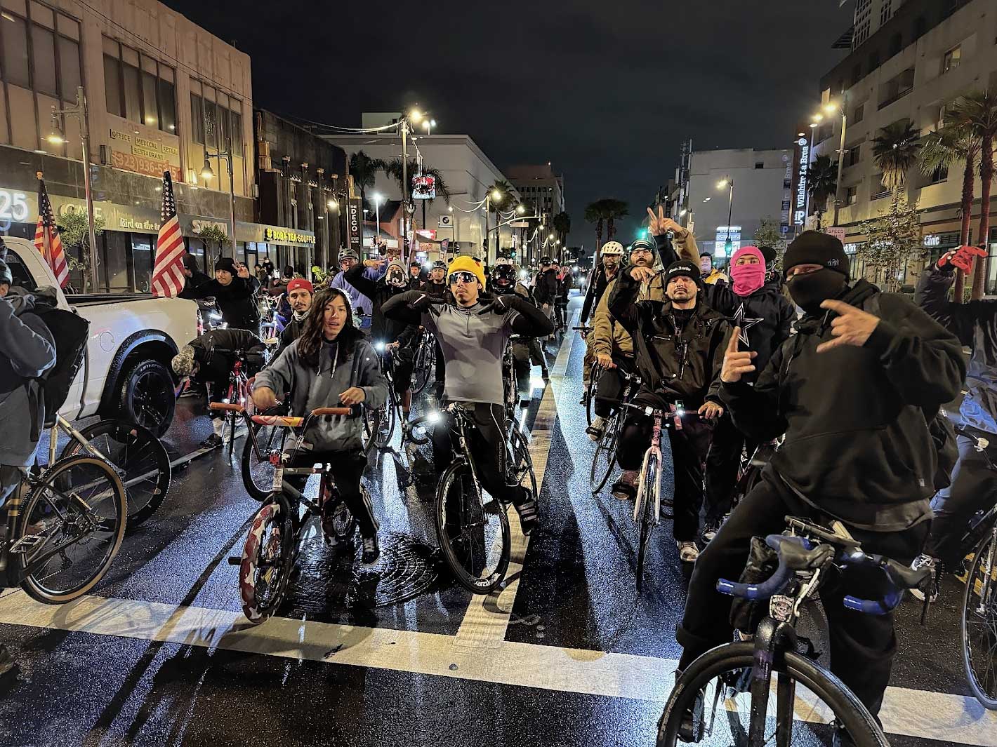 The final Los Angeles Critical Mass ride of the year began under a sky that threatened to pour. News outlets warned of heavy rain, but our community showed up anyway — jackets soaked, lights glowing, spirits high.