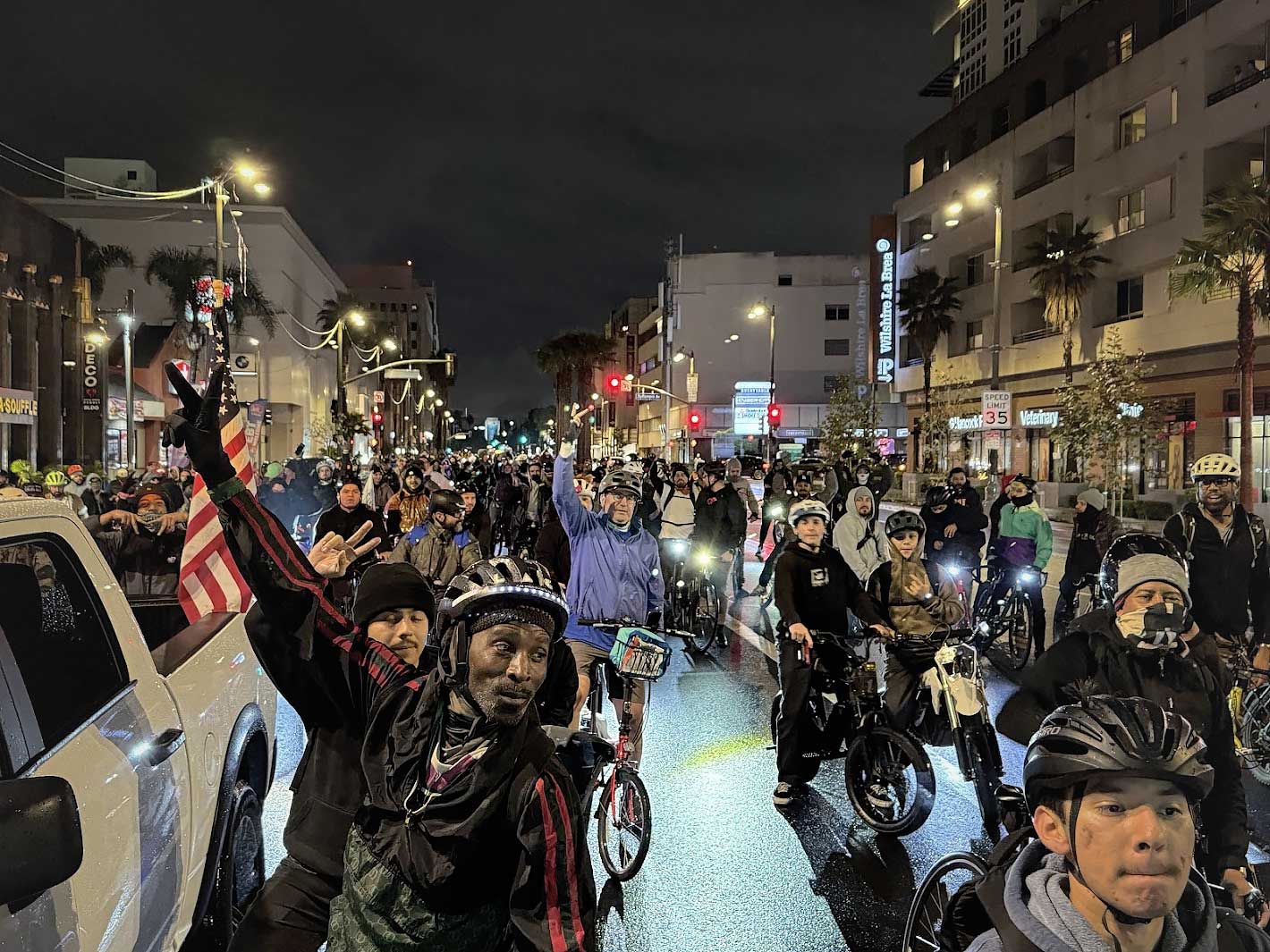 We headed west on Wilshire Boulevard, rolling through Hancock Park, Miracle Mile, and into Beverly Grove. As we rode, the drizzle faded completely. By the time we passed Manhattan Place heading toward Wilton, something incredible happened — waves of cyclists appeared from every direction, joining the ride in massive numbers.